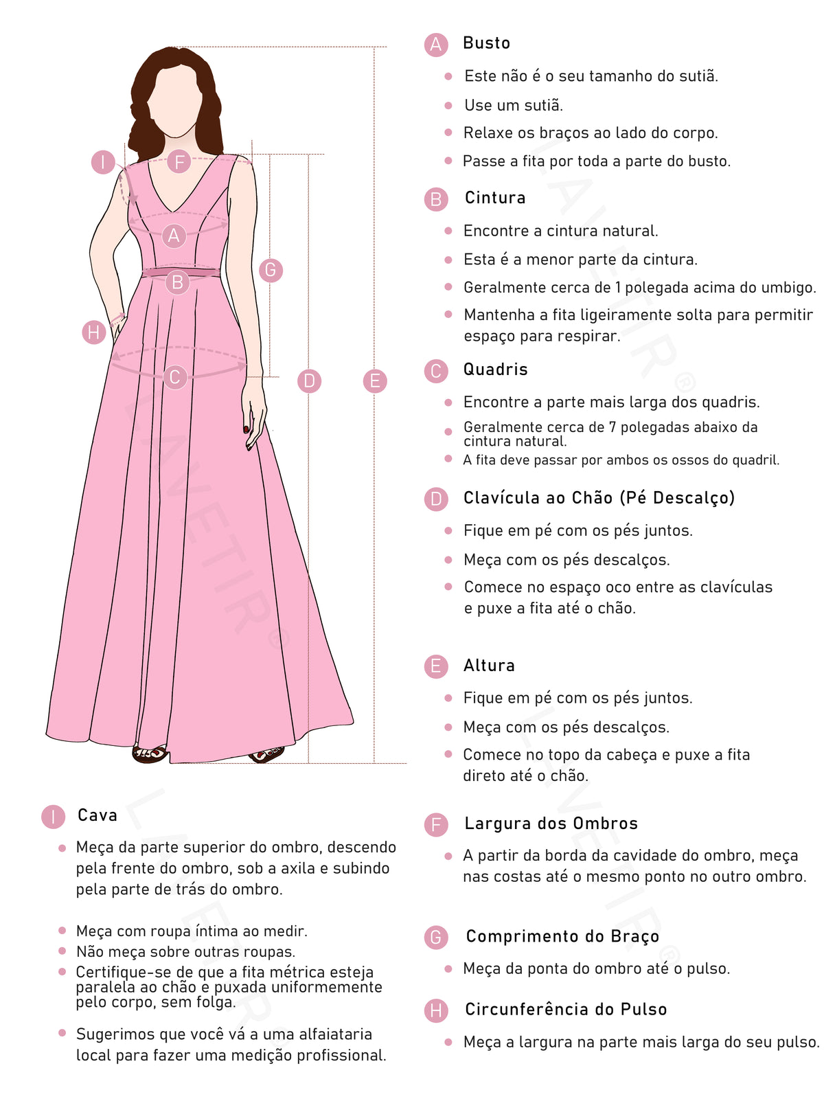 Ao escolher o tamanho customizado, busto, cintura, quadris, clavícula ao chão (para vestidos longos), clavícula à bainha (para vestidos curtos) em CM. Como medir: https://www.lavetir.pt/pages/como-medir